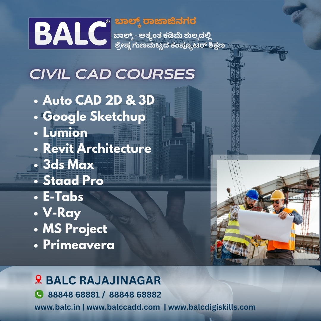 Are you a budding civil engineer, a recent graduate, or a diploma holder looking to gain a competitive edge in the industry? At BALC CADD training center in Rajajinagara, Bengaluru, we offer comprehensive Civil CADD software courses designed equip you with the skills and knowledge you need to thrive in your career.